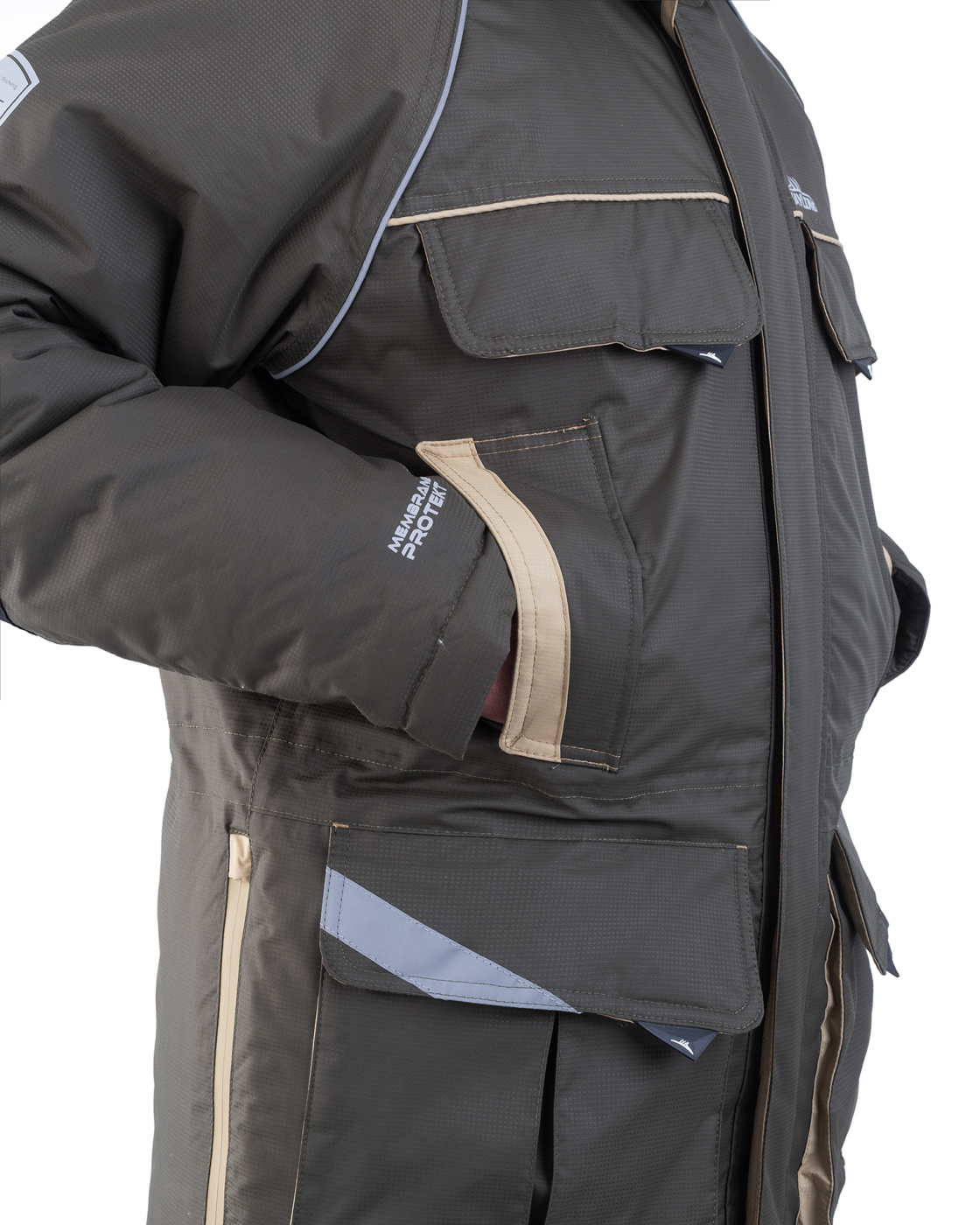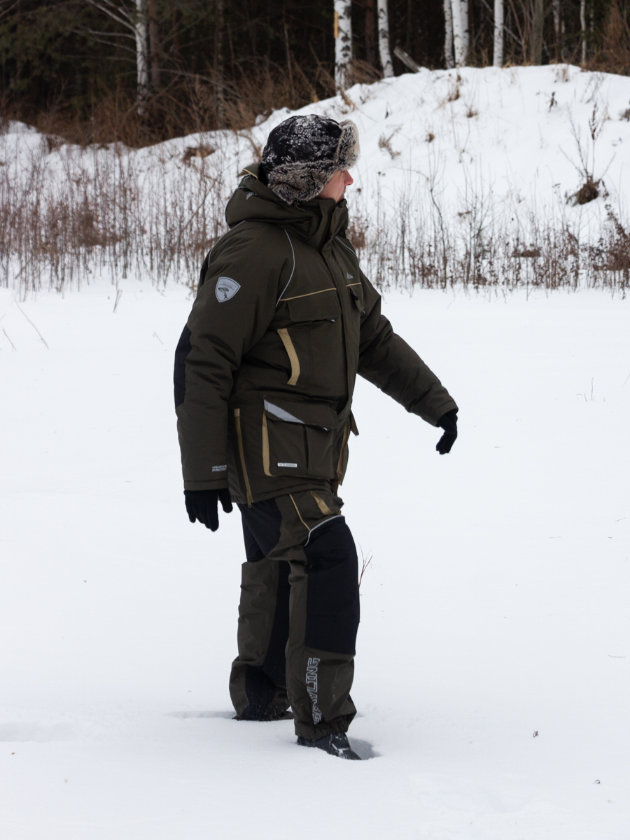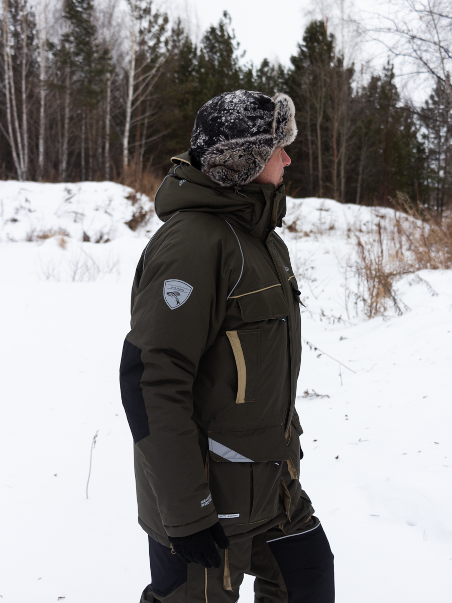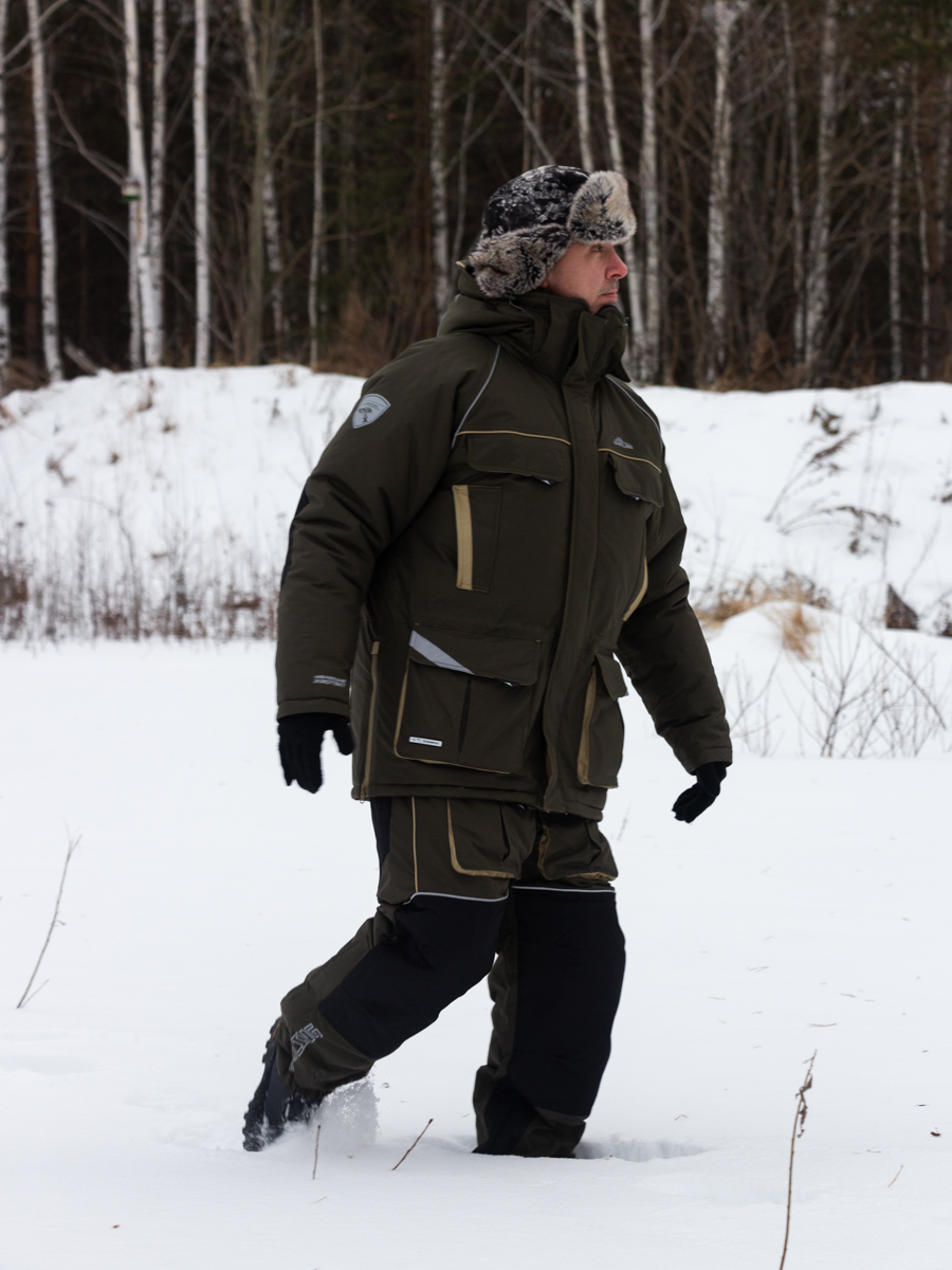 Костюм «Камчатка» для зимней рыбной ловли. Мембранная ткань не продувается и не промокает. Отделка укрепляет износостойкие места (локти, зона сидения, колени).