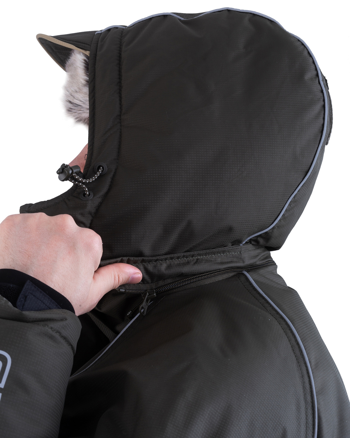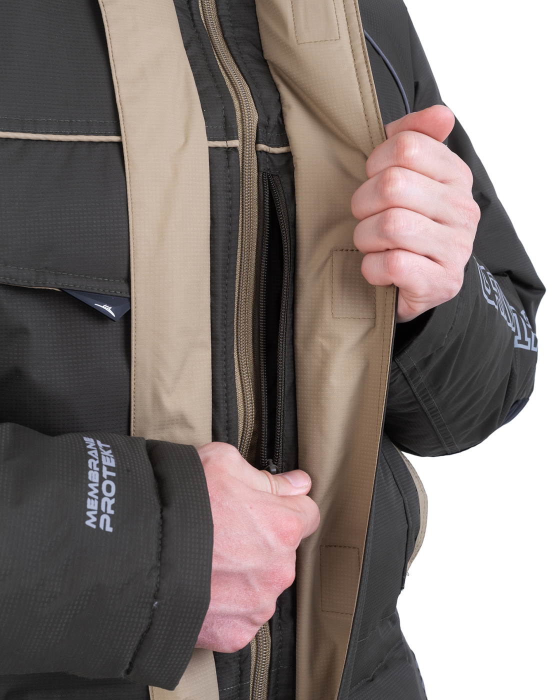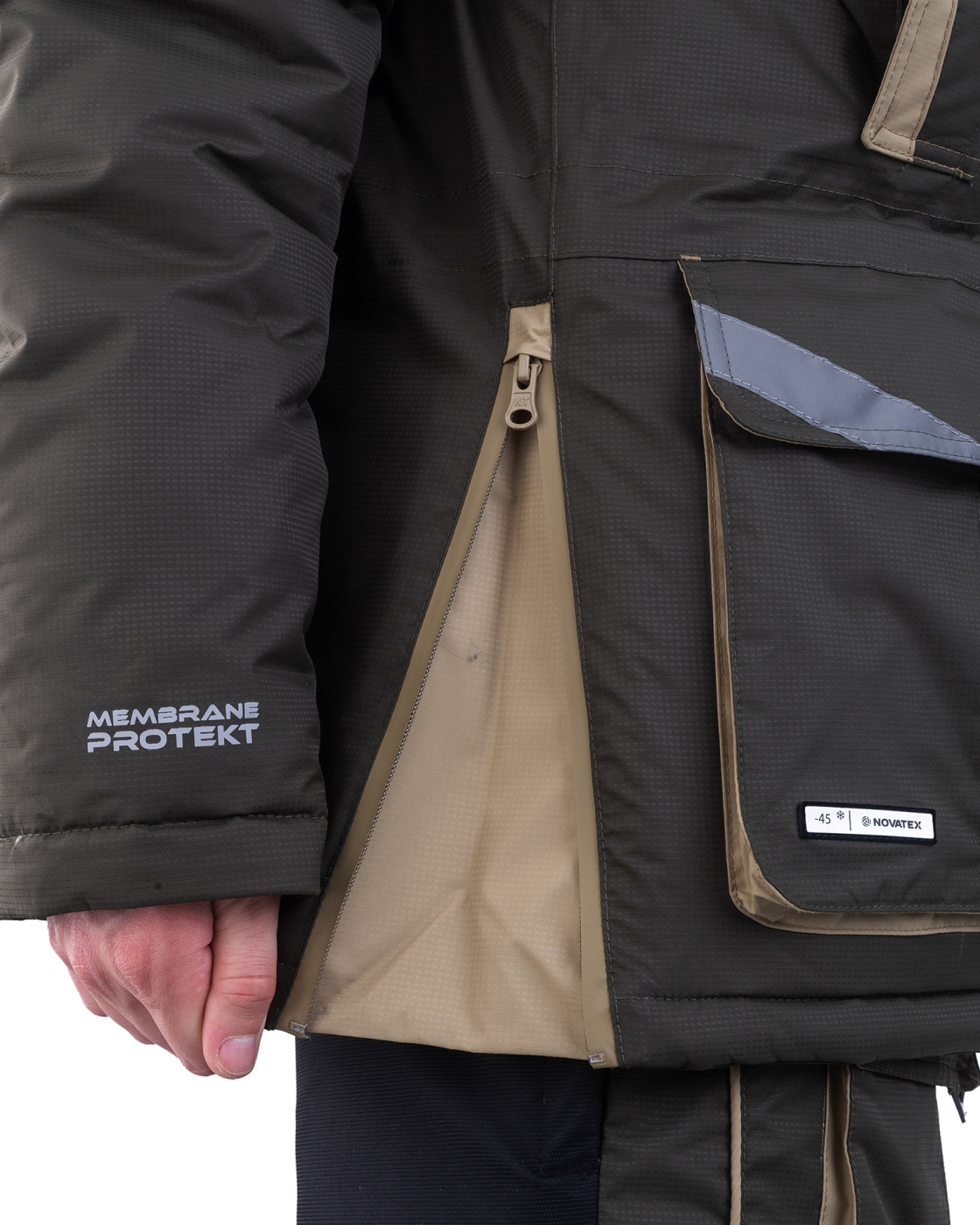 Костюм «Камчатка» для зимней рыбной ловли. Мембранная ткань не продувается и не промокает. Отделка укрепляет износостойкие места (локти, зона сидения, колени).